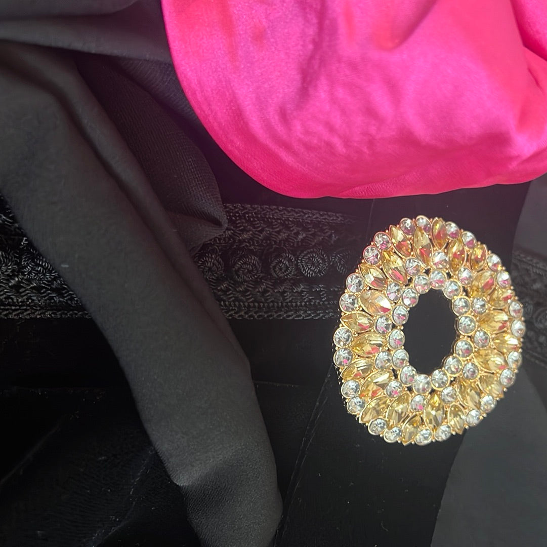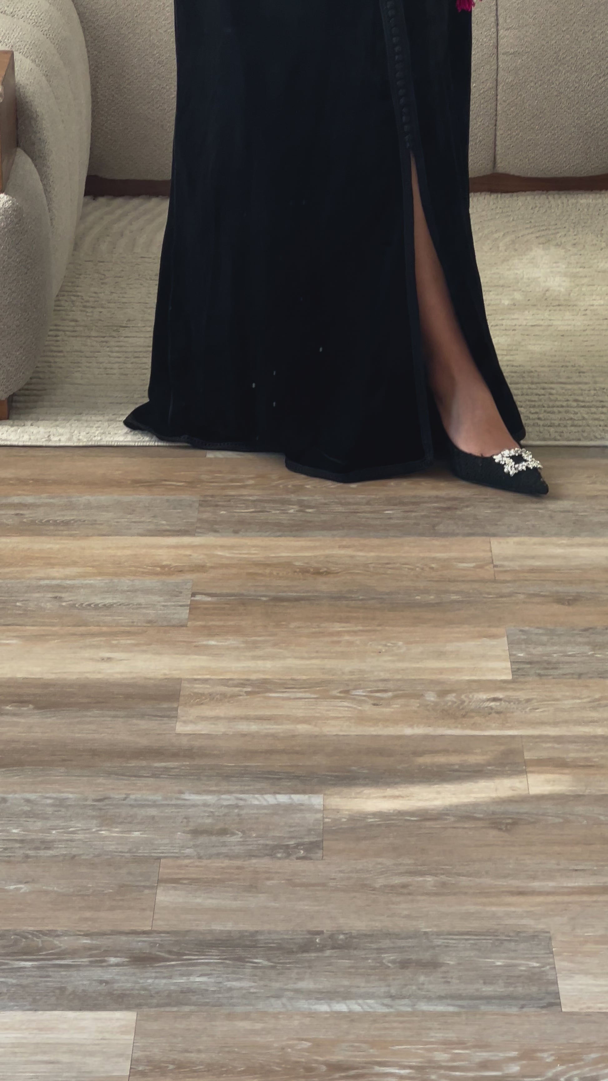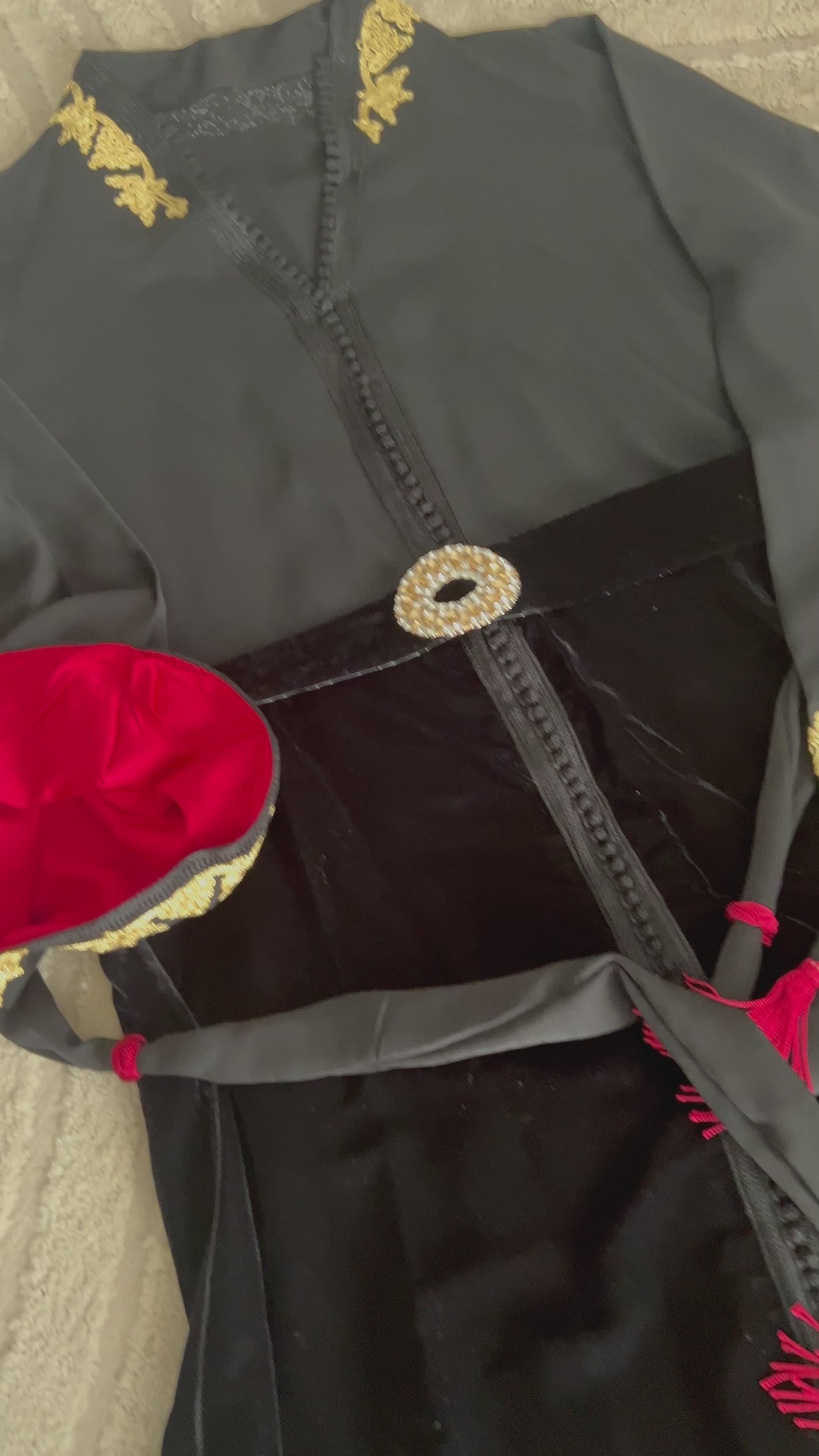 velours de soie et crêpe avec revers rose fushia ou rouge au niveau des manches.