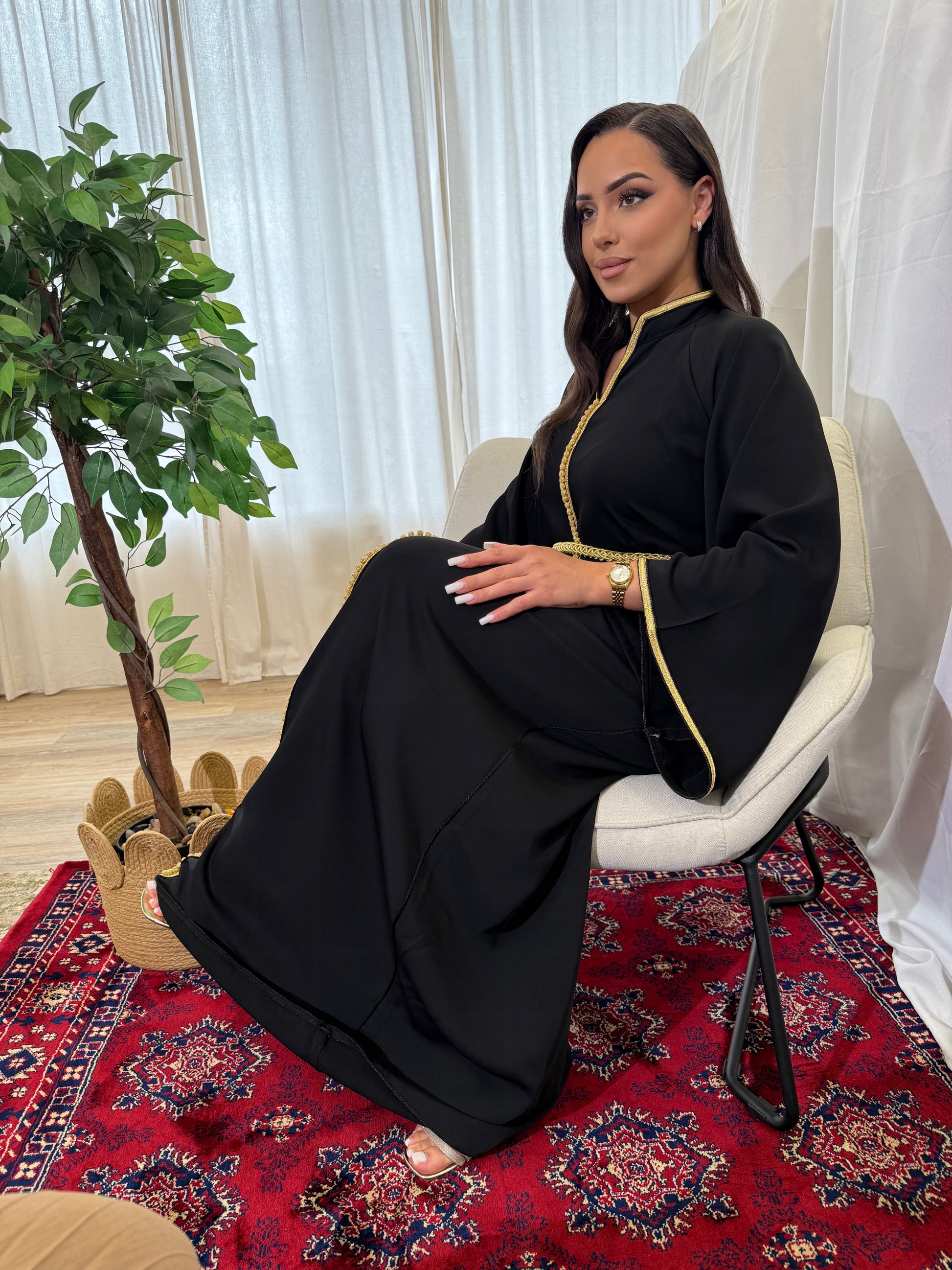 - Couleur : Noir profond rehaussé de délicats galons dorés sur les manches, le col, le devant du haut et la jupe.