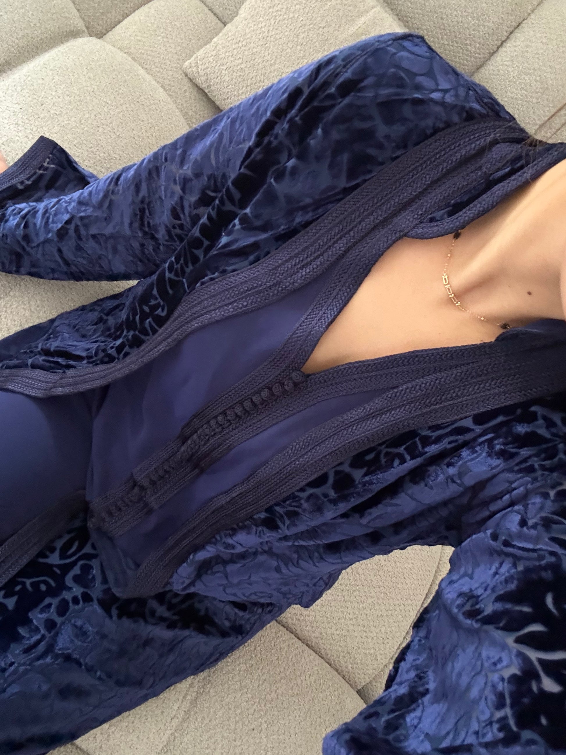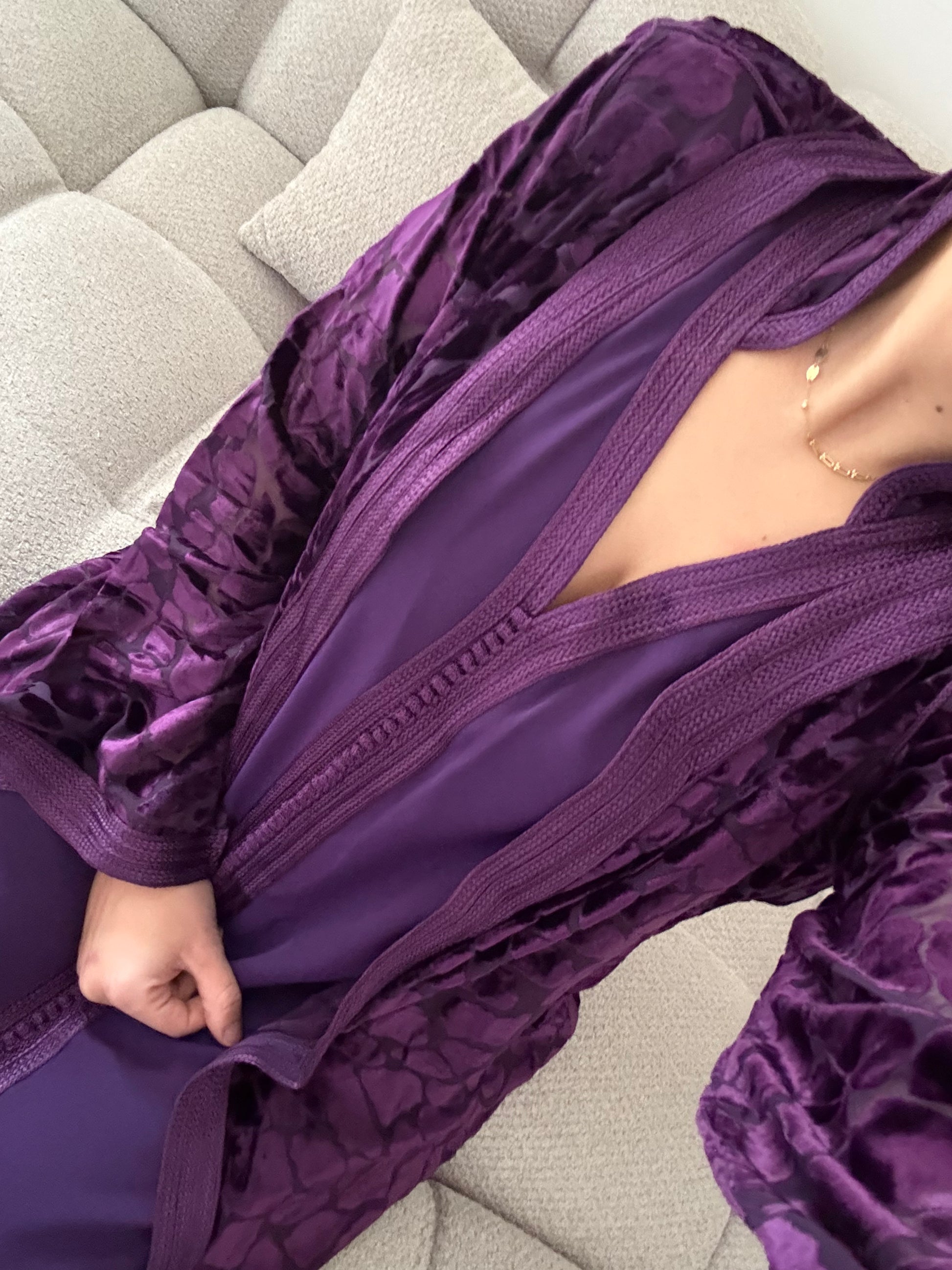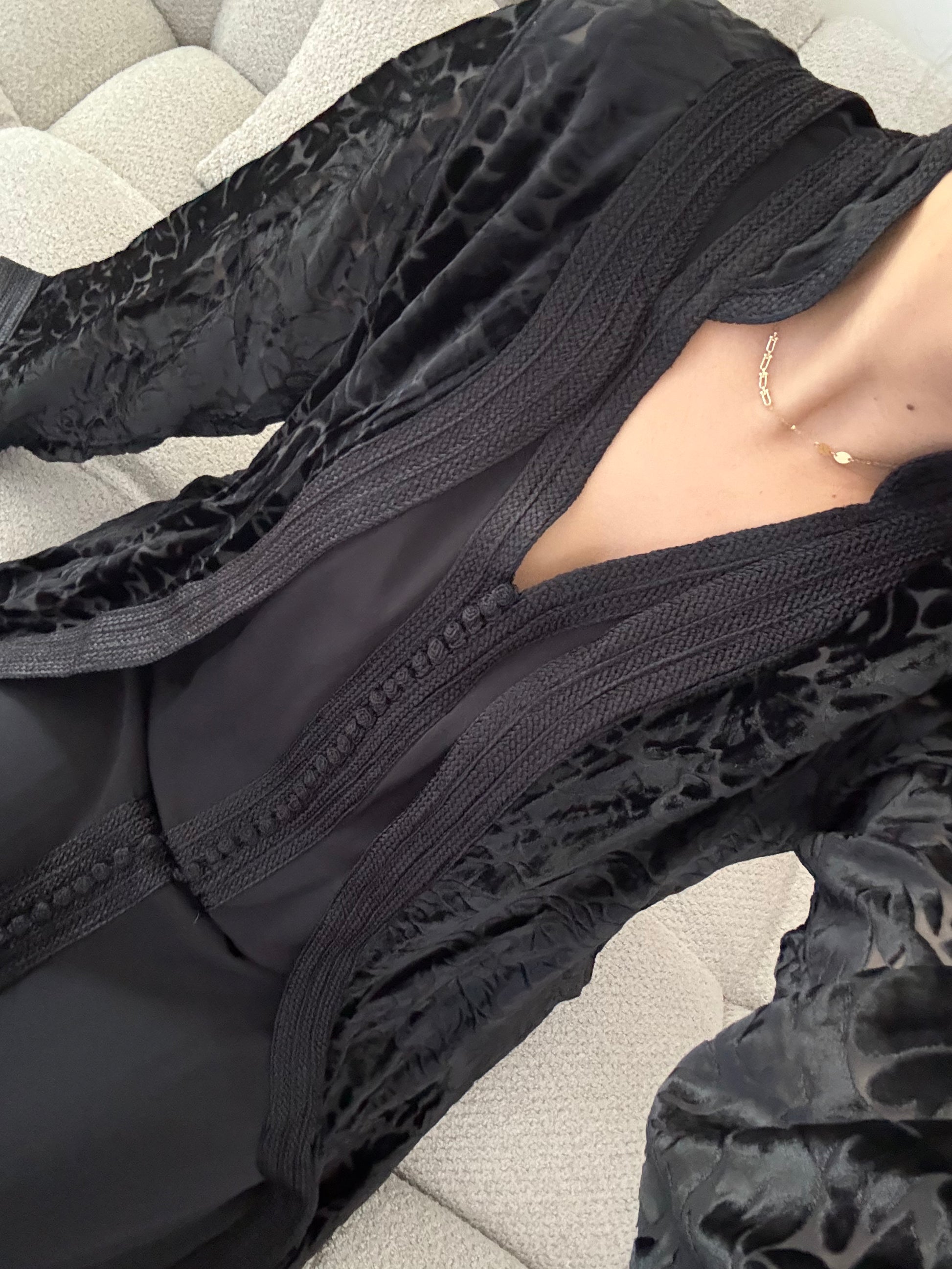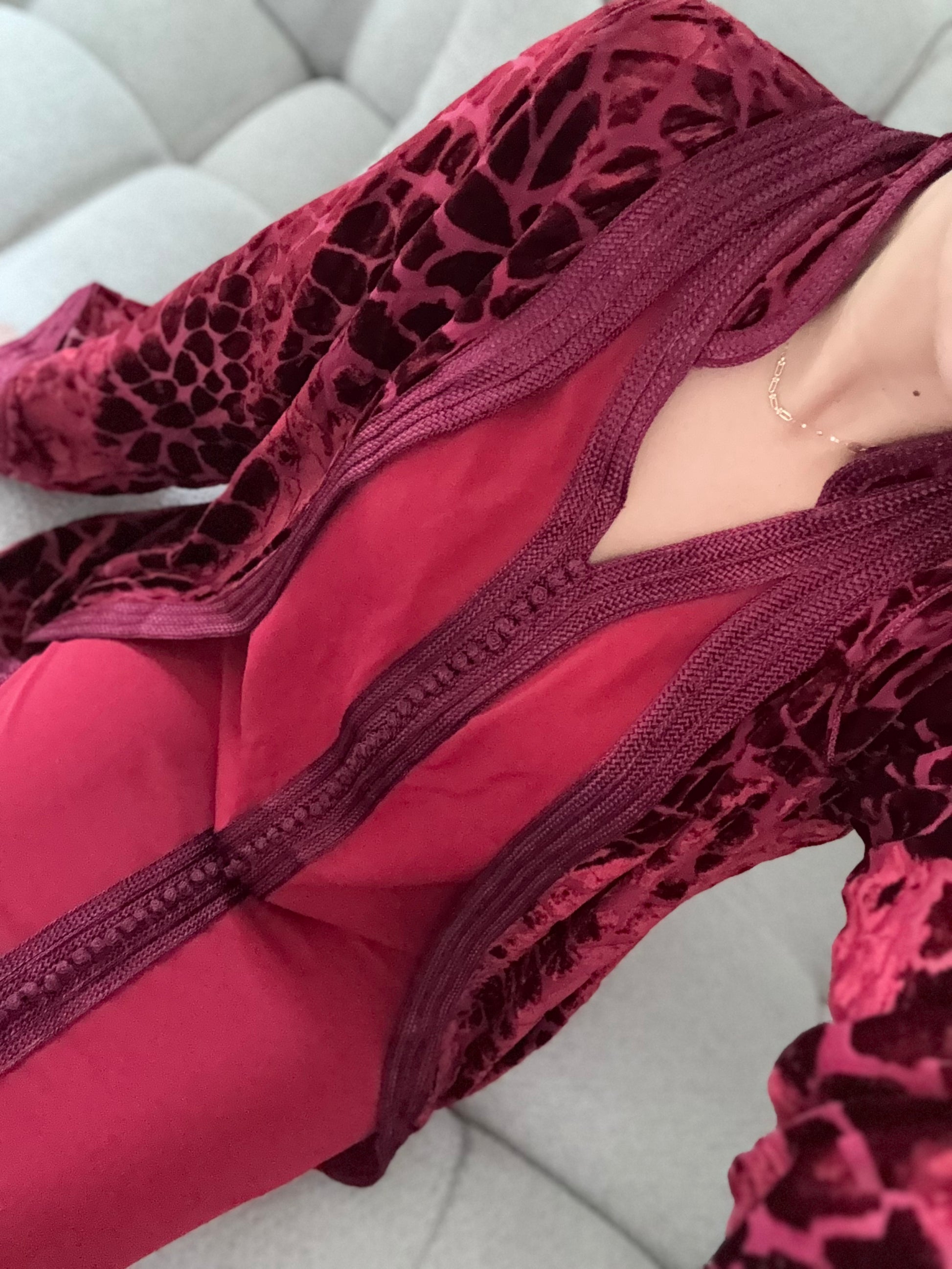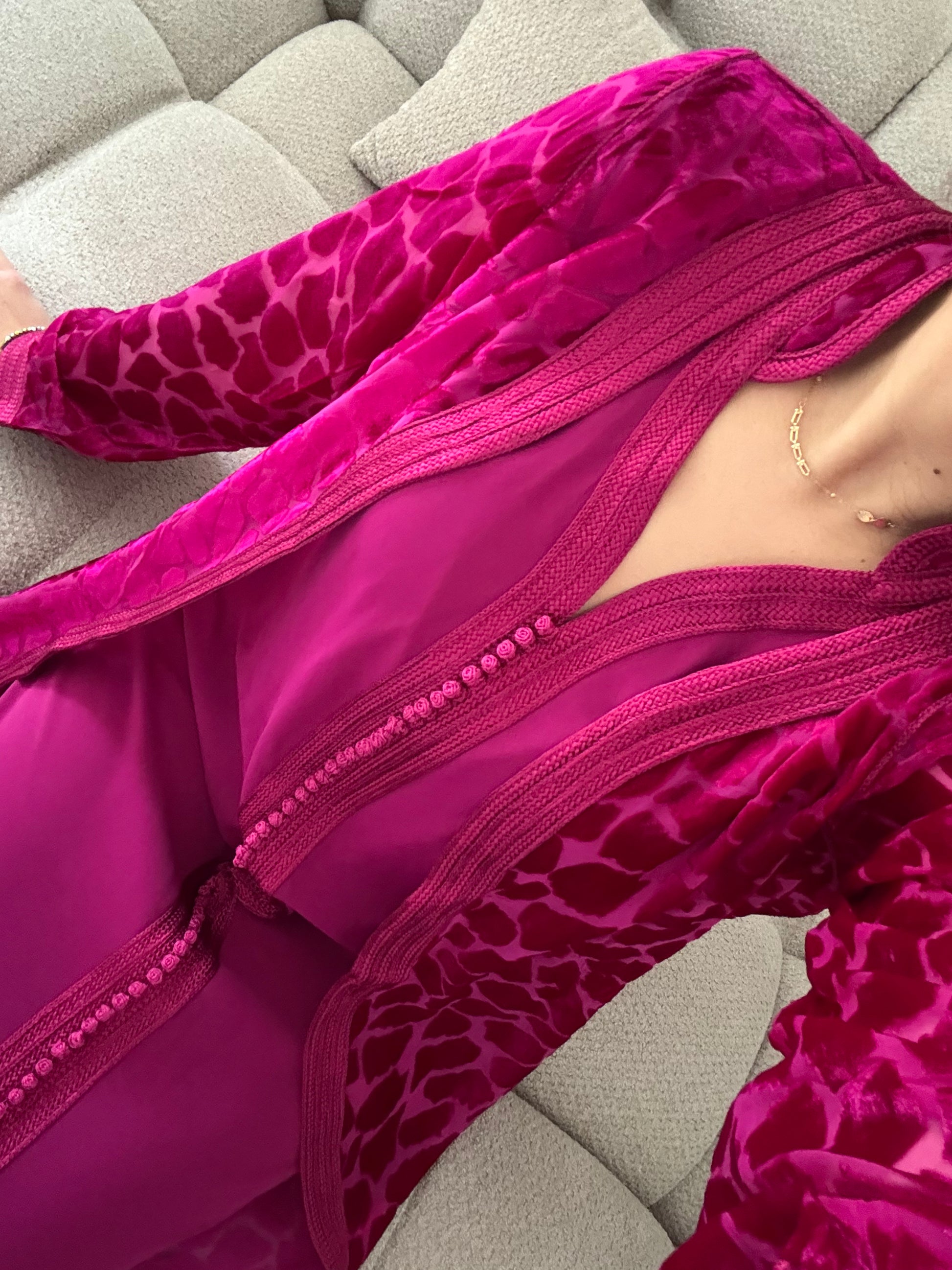 Le kmiss sans manche en crêpe de premier choix, accompagné de son kimono en mousseline avec empiècement en velours de soie, allie élégance et confort. Parfait pour toutes occasions festives.